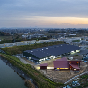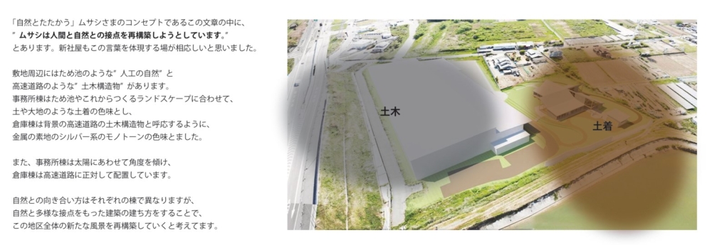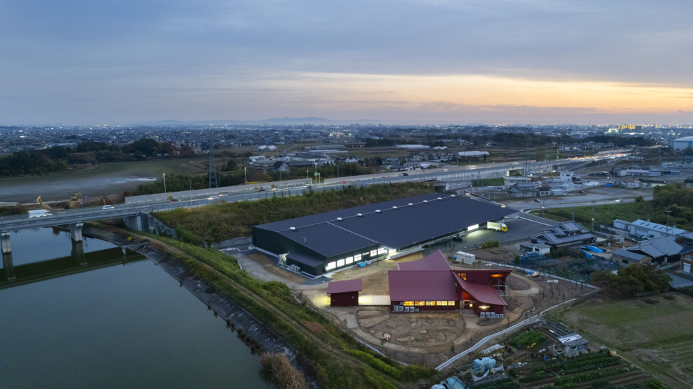 点在する倉庫を集約し、効率性を高めることがプロジェクトの発端。効率的な倉庫とオープンでフレキシブルな事務所としており、季節や時間と共に変化を重ねていく。自然と共にそだっていき、器のようにモノや人が中心にある建築を姿を目指した。