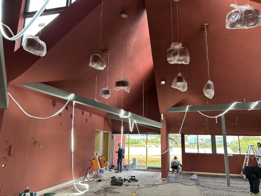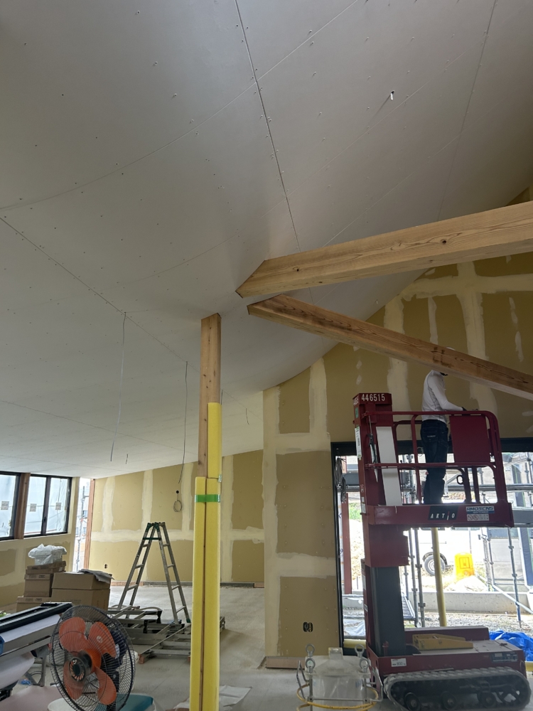 東西南北、四方に開かれた建築を目指しており、仕上も内外ともに同じ色を纏っています。リシンという昔の民家によく使われた素材ですが、こうして壁・天井を同色でそめることで、また違った様相を呈していると思います。