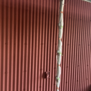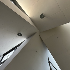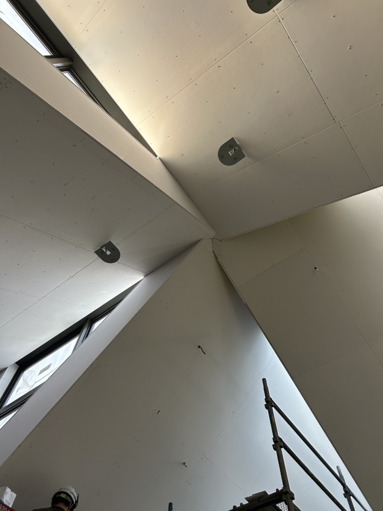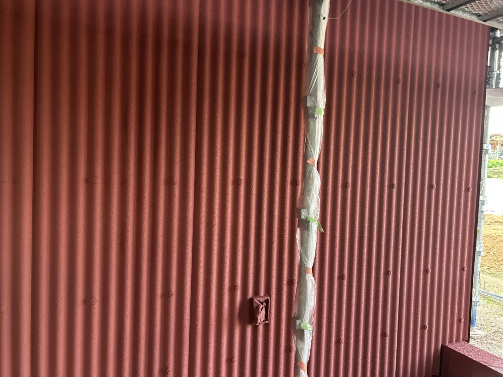 外壁もスレートの波板と昔から倉庫とかに使われるものにリシンを吹くことで、安価ながら陰影があるテクスチャーになってます。特注で同色に塗装してた照明器具もいい感じに取付られてました。