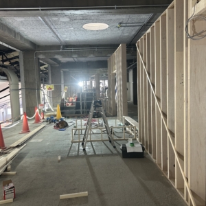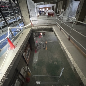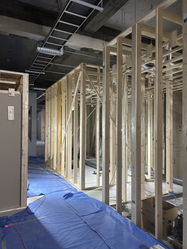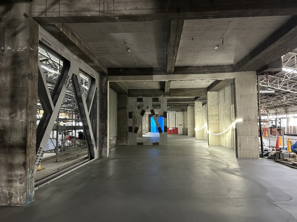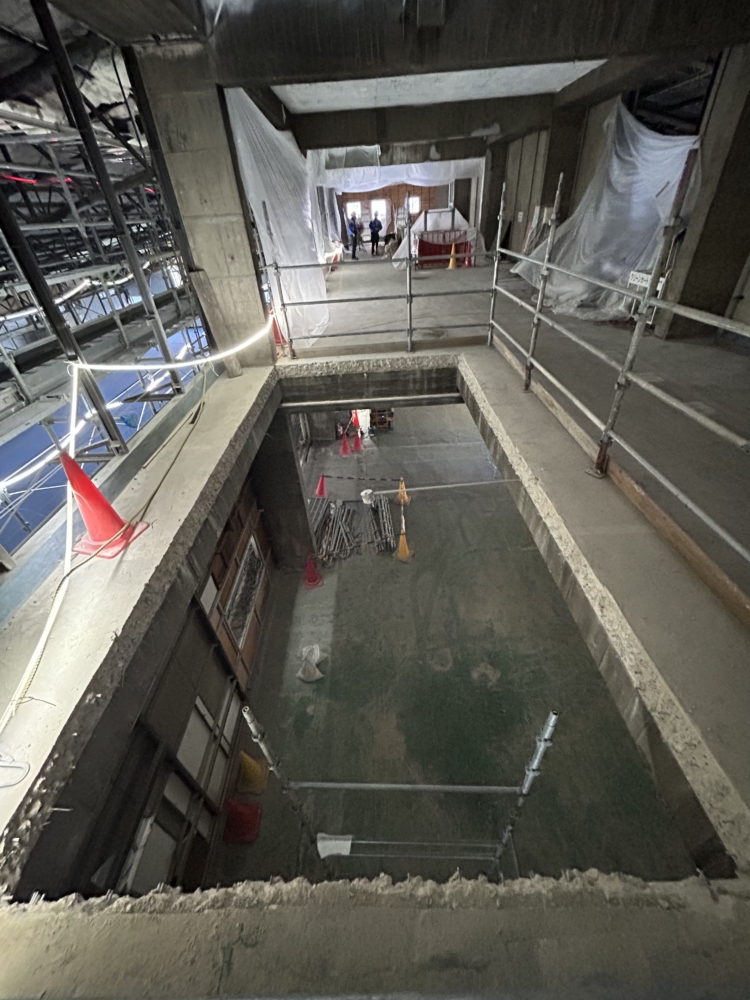 現場が進んでます。今回の提案の1つでもある吹抜けのための床開口が無事空きました!この建物は50mの長さがありますが、両端にしか階段が無い上、踏面・蹴上が小さく使いにくいので、中央に階段を設けて動線を解消しつつ、上下階のつながりを生み出すような構成にしています。